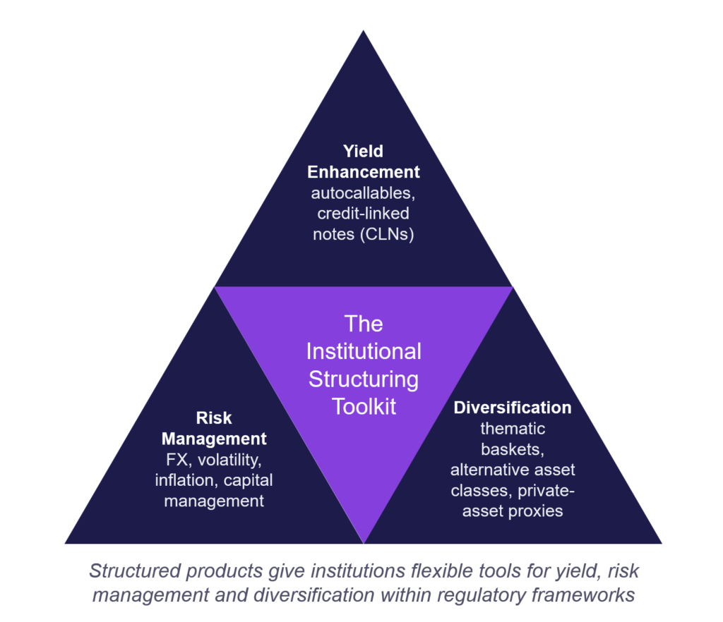 The rationale for structured products is clear: yield enhancement within defined risk parameters, overlays to manage risk exposures and capital-efficient portfolio diversification. Institutional investors are turning to structured products not only for yield, but also for diversification into harder-to-reach exposures, for example, new crypto and digital assets, commodity baskets, real world (e.g. real estate) and even private assets, but in a risk-controlled format.