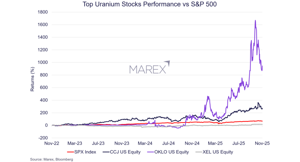 On the equity front, as of writing, OKLO is up 306%, CCJ 70%, and XEL 22% YTD — all outperforming the S&P 500’s 16% gain. These include Cameco (CCJ), one of the world’s largest uranium suppliers; Oklo (OKLO), a recently listed developer of advanced small modular reactors; and Xcel Energy (XEL), a diversified U.S. utility with nuclear generation in its portfolio.