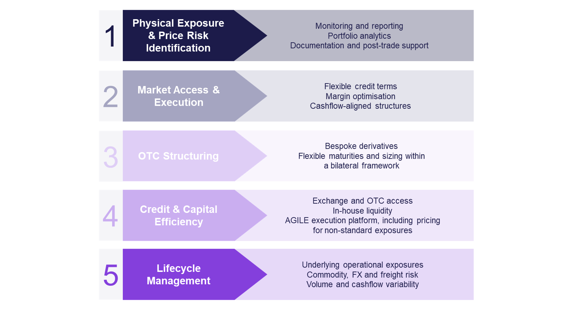 Brought together, these capabilities form an integrated approach to risk management. By participating across each step — from exposure identification to execution, structuring, credit management and lifecycle management — Marex Hedging Solutions operates across the entire hedging value chain through a fully integrated framework.