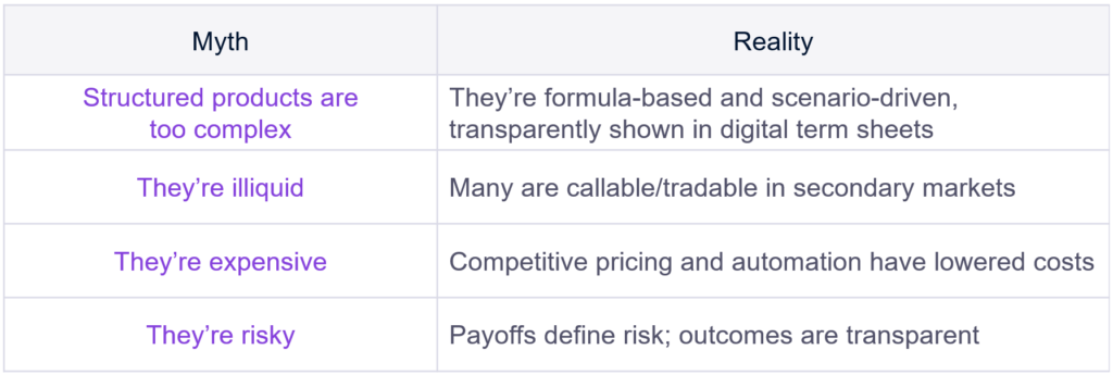 Despite widespread and growing interest in structured products, historical misconceptions about their cost, role and value — particularly around complexity and liquidity — remain. In the past, some of these views weren’t entirely unfounded: opaque pricing, limited transparency, and manual structuring processes often made products appear costly or difficult to compare.