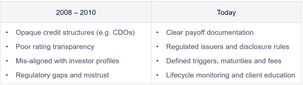 However, we’ve come a very long way since 2008 both in terms of market regulation and mandatory obligations relating to transparency and accountability and investor education around the ‘right way’ to implement structured products within investment strategies.